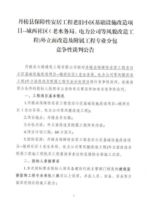 【大雅建筑公司】丹棱縣保障性安居工程老舊小區(qū)基礎(chǔ)設(shè)施改造項(xiàng)目--城西社區(qū)(老水務(wù)局、電力公司等風(fēng)貌改造工程)外立面改造及附屬工程專(zhuān)業(yè)分包競(jìng)爭(zhēng)性談判公告