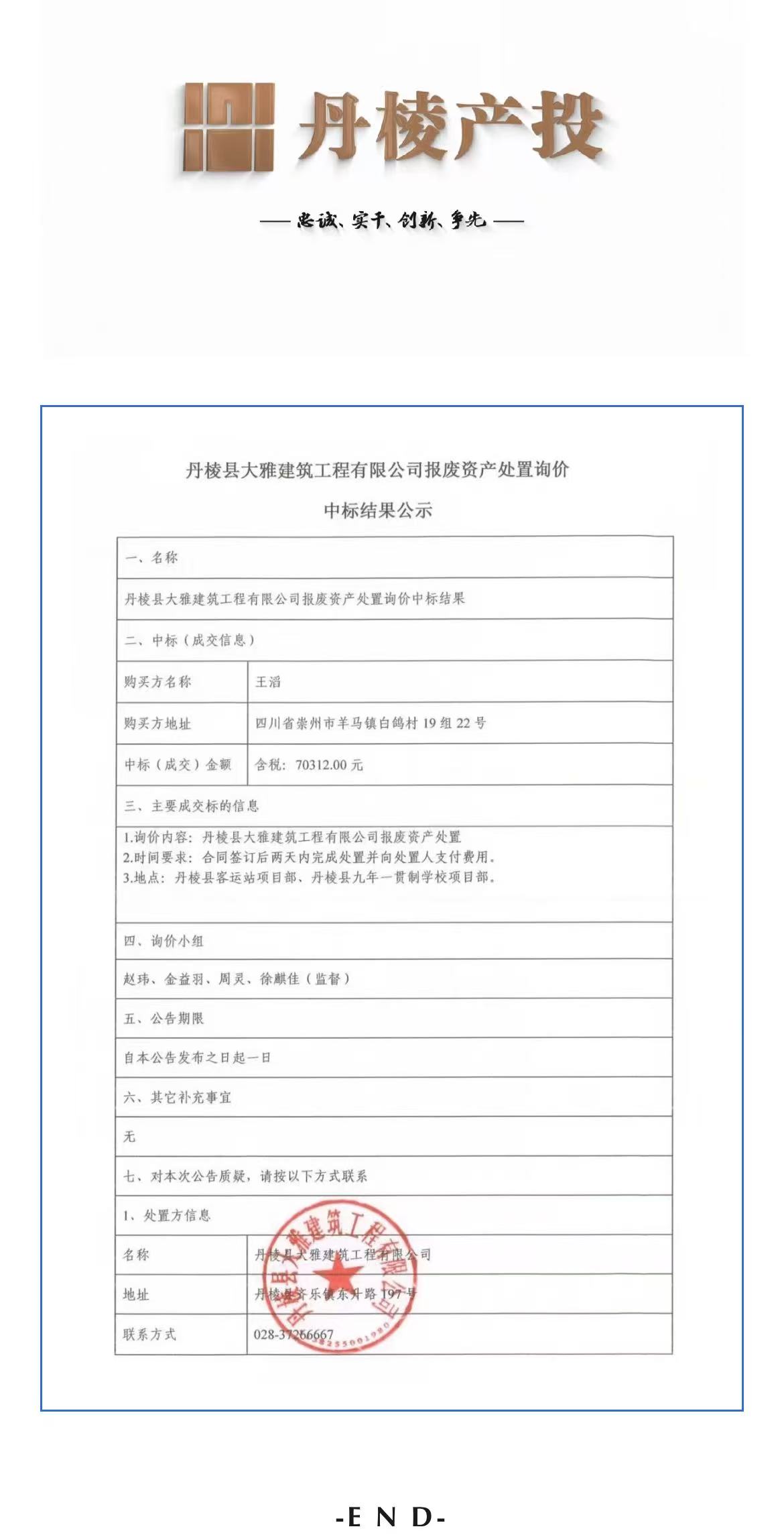 丹棱縣大雅建筑工程有限公司報廢資產(chǎn)處置詢價中標結(jié)果公示
