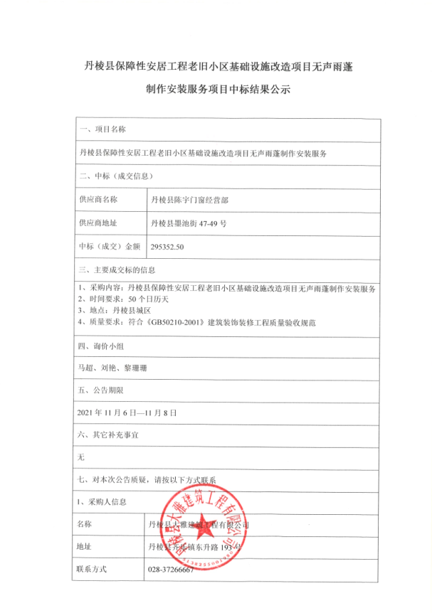 【大雅建筑公司】丹棱縣保障性安居工程老舊小區(qū)基礎(chǔ)設(shè)施改造項(xiàng)目無聲雨蓬制作安裝服務(wù)項(xiàng)目中標(biāo)結(jié)果公示
