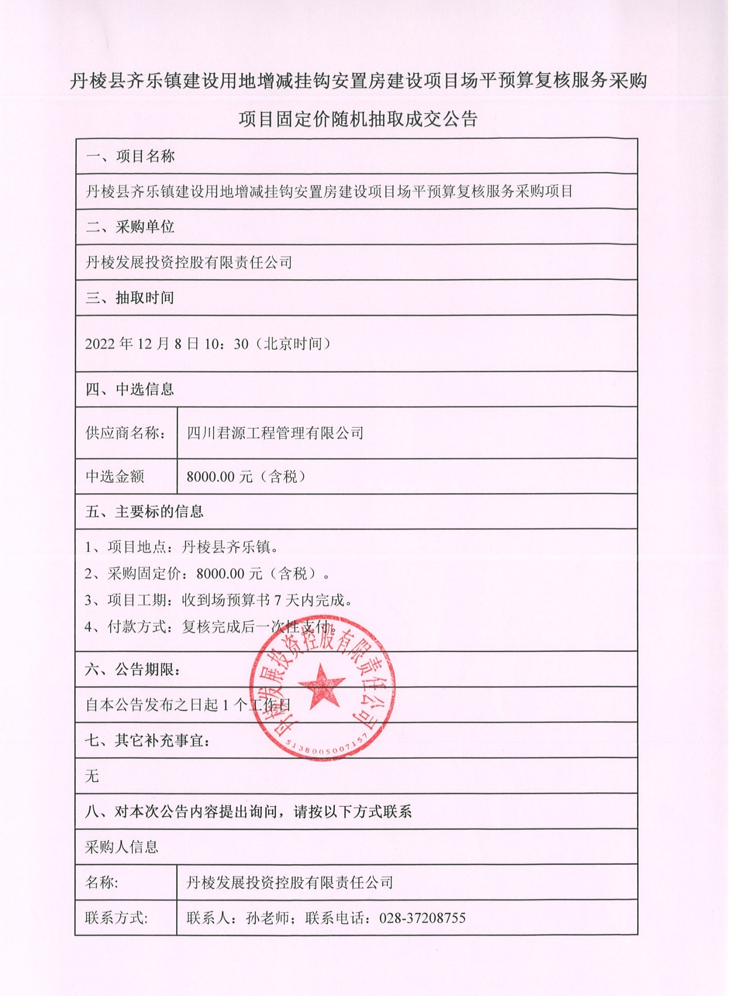 丹棱縣齊樂(lè)鎮(zhèn)建設(shè)用地增減掛鉤安置房建設(shè)項(xiàng)目場(chǎng)平預(yù)算復(fù)核服務(wù)采購(gòu)項(xiàng)目固定價(jià)隨機(jī)抽取成交公告