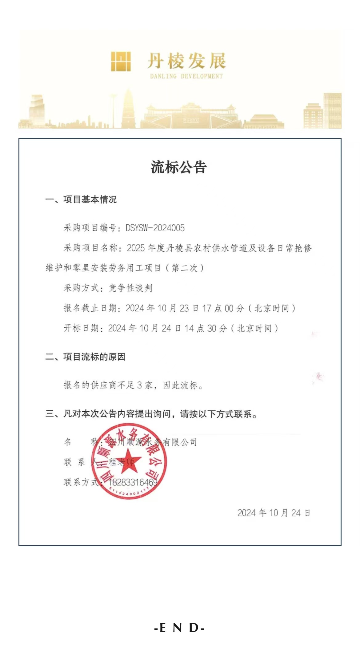 2025年度丹棱縣農(nóng)村供水管道及設(shè)備日常搶修維護和零星安裝勞務(wù)用工項目(第二次)流標公告