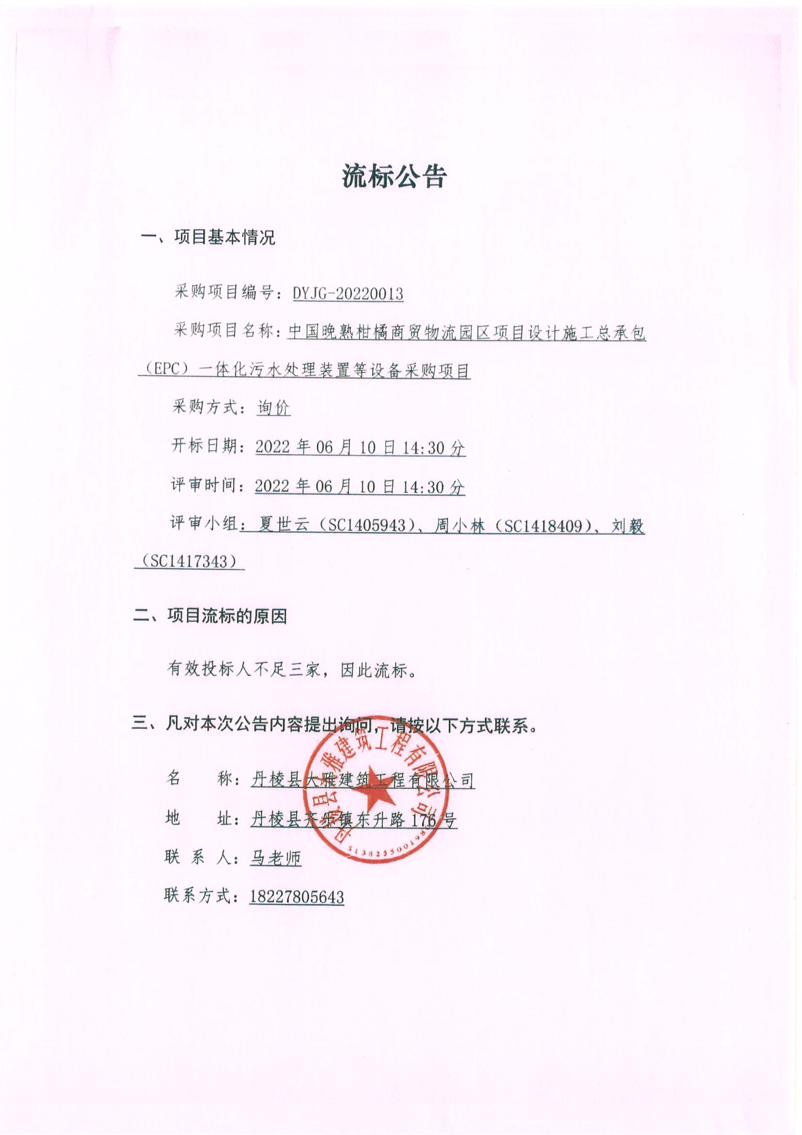 中國晚熟柑橘商貿物流園區(qū)項目設計施工總承包(EPC)一體化污水處理裝置等設備采購項目流標公告