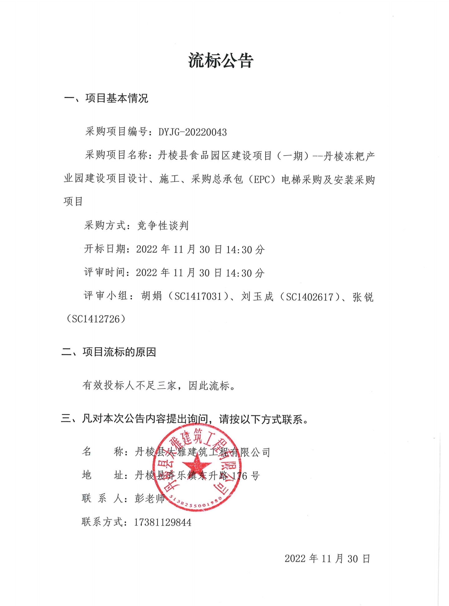 丹棱縣食品園區(qū)建設項目 (一期)--丹棱凍粑產(chǎn)業(yè)園建設項目設計、施工、采購總承包 (EPC) 電梯采購及安裝采購項目流標公告